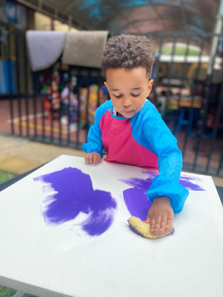 In our art session, the children explored creativity through color and shape in a fun and engaging way. They began by painting a vibrant purple background, carefully using their brushes to cover the paper and express themselves freely. This activity not only helped them practice brush control and color recognition but also encouraged them to take pride in their work as they watched their blank pages transform into bold, colorful canvases.