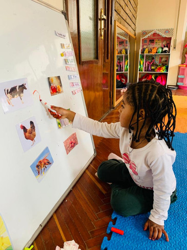 We introduced the children to familiar animals such as a cow, a bee, and a chicken. On the other side, we placed pictures of milk, honey, and eggs. The children were given markers and encouraged to match each animal with the correct product by drawing lines between them. This simple but engaging activity helped develop their early literacy skills, including recognition, association, and fine motor control.