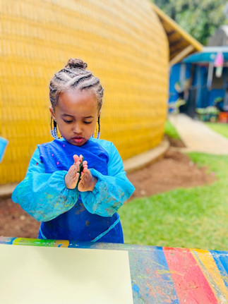 In our art session, we continued our color-mixing project. This week the children mixed yellow and blue to make green. After explaining the activity, we placed paint on each child’s palms and they rubbed their hands together to see the color change. Their excitement as they exclaimed “look! Green! Green!”—was priceless.