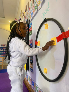 creating their own clock. Using a hula hoop as the clock frame, each student wrote