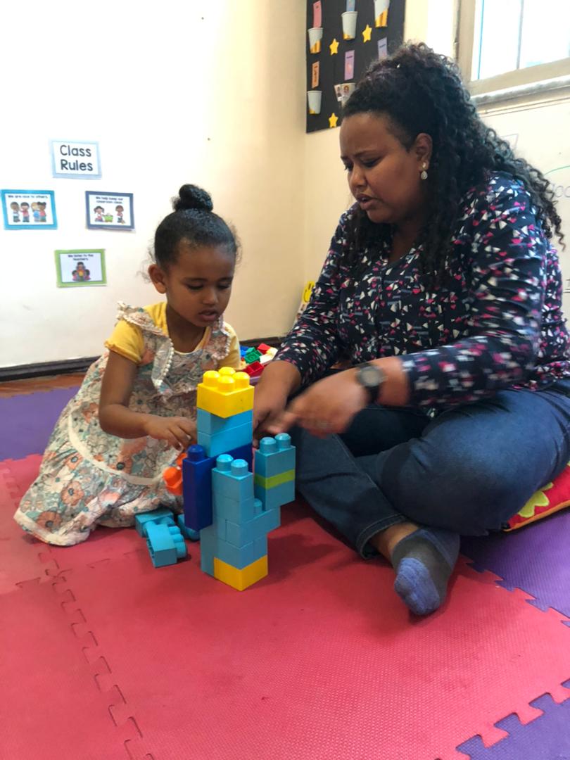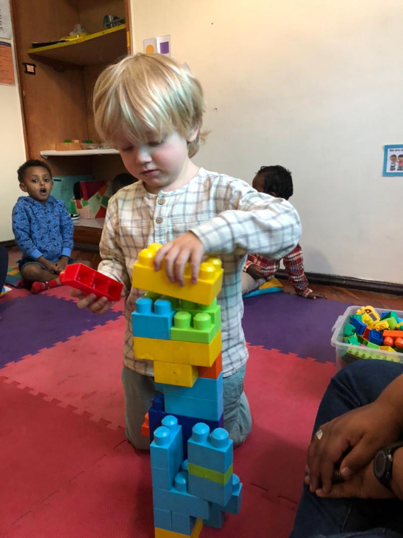 Cooperative game: We played a tower building game where students had to throw dice and count how many dots, they got then take blocks according to the numbers of the dots they got and help build the tower. In this game all students were building one tower, so they practiced counting and learned how to work together, they felt proud seeing the result!