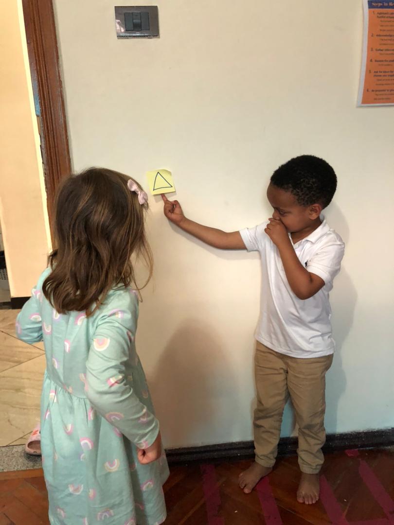 Large group: in our large group this week we had the triangle as the shape of the week and number four “4” as the number of the week. We also had different morning messages in which the students had to match numbers, finish a pattern or find a triangle in the room.