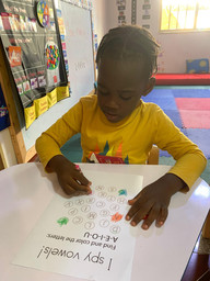 This week in Pre-K literacy, we learned about vowel letters. In our first session, we introduced vowel letters using Zoo-Phonics and by writing everyone's name on the board. We showed them that every word contains vowel letters.