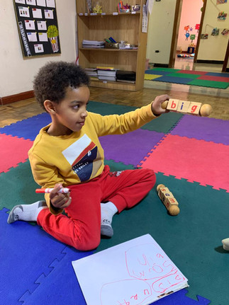 This week in literacy, we focused on phonemic awareness with the "CVC roller stick" activity. Each child had two roller sticks and took turns rolling the letters to form CVC words. They then wrote down the words they spelled out and had a chance to read them aloud to the class. The second literacy activity was a reading session. We printed simple sentences using the sight words the children have been learning during large group time, as well as words they can read by sounding out. Many of the children surprised us with how well and quickly they were able to read the sentences. This will help prepare them for reading more complex words with multiple syllables.