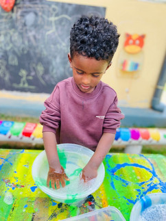 In our art session, we focused on color mixing, and the children were very excited to experiment with different colors. We began by mixing red and white, and they were amazed to discover that these colors create pink. We talked about how new colors can be made by combining other colors, and the children enjoyed seeing the transformation happen right in front of them. For our exploration activity, we made homemade playdough using flour and water. The children eagerly took part in measuring, pouring, and mixing.