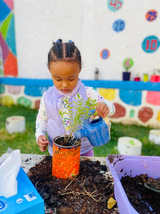 In our science activity, the children planted their favorite flowers. We went outside, and each child took a turn digging soil into their pot, placing their flower inside, adding more soil, and watering it carefully. The children were very excited and proud of their plants. They watched each other closely, encouraged one another, and stayed focused throughout the process. It was wonderful to see their fine-motor skills, attention span, communication, and listening skills developing as they worked.