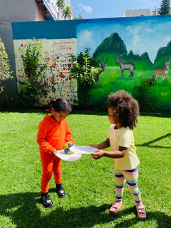 Our literacy activity focused on practicing cutting skills using scissors. We set up two tables on the grass area outside and brought the children out of the classroom to enjoy the activity in an open space. We began by explaining the activity and demonstrating how to safely and properly use the scissors. Each child was then given a piece of paper to practice cutting. The children were excited and highly engaged, enjoying the opportunity to explore and create by cutting the paper. Most of them did very well and showed good focus, while a few students need more practice, which we will continue to support in future sessions. Throughout the week, we provided regular opportunities for the children to practice using scissors, helping them build confidence and improve their skills.