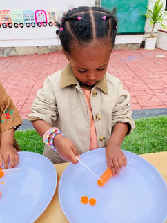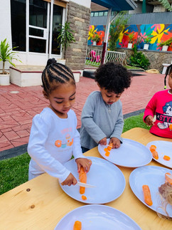 Our science activity this week was focused on exploring the color orange through a hands-on experience with carrots. We began by encouraging the children to connect the activity with the color orange. The children first washed their hands, practicing good hygiene. Then we showed them the boiled carrots and asked questions like, “what is this?” and “what color is this?” The children excitedly responded, “carrot!” and “orange!”.