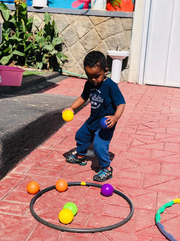We began our most recent gymnastics activity by preparing two hula hoops outside. One hula hoop was filled with colorful balls, while the other one was left empty. We explained to the children how to move the balls from one hula hoop to the other. Once the activity started, the children took turns picking up a ball, naming its color, and placing it carefully into the empty hula hoop.