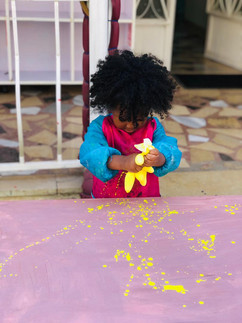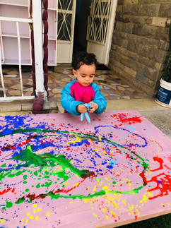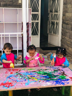 In our first session, we started by painting the background of the canvas using light brown paint and sponges. The children worked together, taking turns to dab and spread the color. They enjoyed the process and were very focused while painting. In the second session, we introduced a fun glove-painting activity. We added different colors of paint onto the gloves, and the children squeezed and pressed their hands onto the canvas to make textured prints. Our students were excited to see the colorful results!