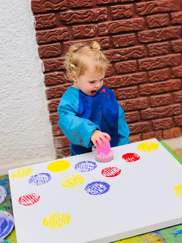 In the second week, we prepared small cups by covering the top with plastic. The children chose their favorite paint colors, dipped the cups into the paint, and stamped them onto the canvas. They enjoyed creating circle shapes and watching the patterns appear.