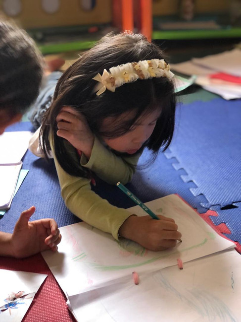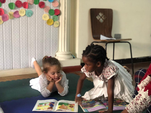 In literacy, the class used their momentum from the previous session (which was a rousing success) and made yet another amazing group story! We started by asking the class which of them remember their story from last time, and briefly discussed the plot points and characters. Then, we let them know that today they were going to be making another one, with the same format of each child saying a small sentence or phrase turn by turn, building a story over time. The energy and excitement were off the charts! This time, the story was very different to the last one but was just as interesting. The story starts on a farm. The people on the farm decide that they want to go to their friend’s party. At the party, there were all kinds of activities like movie night, eating cake, dancing and more. Then, chaos erupted! It started to rain, and a storm came with thunder and lightning. Thankfully, the storm didn’t last very long and left behind a beautiful rainbow. The party started again, and everyone ate some more cake and drank strawberry juice. Then, there was more rain and when the sun came out again there was a second rainbow! Everyone went to play outside, and in the end, even a bunny and unicorn came to join the fun. This was a beautifully joyful story, and we can’t wait to put this one and the last into a storybook soon.