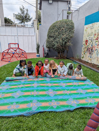This week in our journal, we went outside into the new compound and chose a grassy area. We laid down a mat, and some of the children lay down while others sat up to work on their own journals. After they finished, we wrote down what they told us on the back of the page. Once we were done, they cleaned up by rolling up the mat together and putting it back. They were very excited to do their journals outside, especially with the mat on the grass and in the new compound! As always, they worked hard on their creations, which show us a lot about their individual personalities and interests.