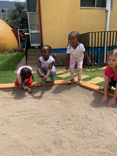 Next, we transformed our school slide into a water slide! With the help of water pipes, we poured water from the top of the slide, allowing our children to slide down onto the grass. We also had two pools set up in the sand area - one filled with water and small beach balls, and another play pool. Our children enjoyed tossing the balls around and splashing in the pools.