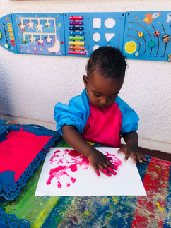 Our recent art session was a messy delight! We prepared different colors of paper and colored paints for hand stamping. Before starting, we showed the children their hands and talked about how many fingers they have. Together, we counted their fingers, encouraging them to use their own words and participate in the conversation. After our discussion, each child had the chance to choose their favorite color of paper and paint. They dipped their hands into the paint and stamped their handprints onto the paper. The children were very excited to see their colorful prints and enjoyed the creative process. Once they finished stamping, the children washed their hands by themselves and helped with cleaning up the materials. Overall, this art session supported creativity, counting, color recognition, and independence, and the children did a wonderful job.