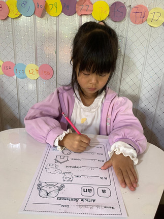 This week, we dove into the world of articles, focusing on "a" and "an." In our first session, we discussed how to use these articles, explaining that "an" is used before words that begin with a vowel (a, e, i, o, u) and "a" is used before consonants. We had fun saying a word and having our children sort the articles together, calling out "a" or "an" at the same time. To make it practical, they received a worksheet where they read sentences and identified which articles corresponded to each question. In our second session, we made it even more engaging! We gave our children white paper and pencils and took turns saying words. They wrote down the words along with the appropriate article. It was so much fun to see them trying to find a vowel word so they could use "an”.
