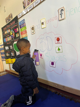 Alongside our daily routines; setting the date, updating our caterpillar days, practicing letters and numbers, and reading our weekly book, we added even more joyful moments in this week’s large group sessions. We began the week by talking about how their weekend went at the bazaar. Using feelings, gestures, and full sentences, our children shared what made them happy or excited, and we all enjoyed listening to each story. The next day, we practiced writing on the board together. Our children took turns coming up to write simple words, sounding them out as a group, and they loved being “the teacher” at the board. Our big focus for the week was 3D shapes. We introduced spheres, cones, cylinders, and cubes using classroom objects; balls, markers, blocks, and cups helping them explore the shapes by touching, rolling, stacking, and comparing. We practiced naming their faces, edges, and how they move. By midweek, children were proudly spotting 3D shapes all around the room and compound!