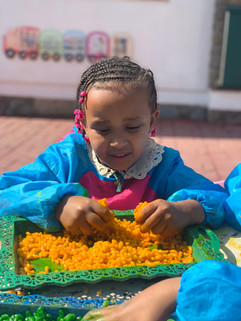 We headed outside by the infants and toddlers area for a colorful hands on activity; dying our elbow macaroni for next Monday’s art session! Our children worked in pairs, first exploring the texture of the macaroni with their hands, then choosing their favorite colors to mix and create their own vibrant pasta pieces. They absolutely enjoyed watching the colors spread. The excitement grew even more knowing these dyed macaroni pieces will become their very own handmade necklaces next week!