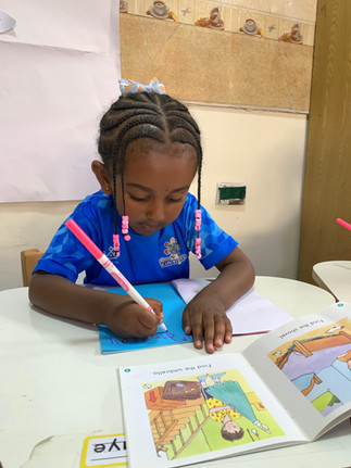 Literacy this week was hands on and filled with proud moments. For our first session, our children chose “I Can Read” CVC books and settled either on the class mat or by the reading area to dive into their stories. They practiced sounding out each letter, blending the sounds together, and reading short words all on their own. The room was full of little voices whisper reading and big smiles each time they figured out a new word. In the next session, they used their very own handmade literacy books; books they folded, stapled, and decorated themselves in past weeks, to write words and short sentences from the stories they read earlier. This gave them a sense of ownership and responsibility, turning them into real authors as they proudly copied words, built sentences, and expressed their learning in the books they created.