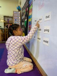 One of our favorite parts of large group time is listening to our children share their weekend stories on Mondays. It has become even more enjoyable as they grow more expressive and creative with their words, eagerly sharing their experiences and capturing their friends’ attention while talking about their activities outside of school. Our daily large group routine continues as usual. We begin with a transition song from our free choice book reading time, followed by a fun stand up song to get everyone moving. Then we set the date on our calendar, add a new number to our growing caterpillar, enjoy song breaks, and continue with our large group lesson. This week, our large group lesson focused on reading sight words from the board. Our children did a wonderful job participating and reading along, which helped them build even more confidence in their reading skills.