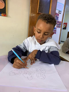 “Me Betselot my sister we together eat pizza. My mommy said it’s raining so my next time so I drink water” -Yemariam
