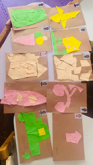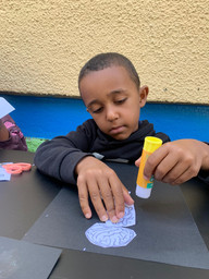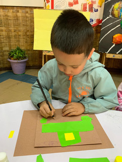 This week, we revisited our “creating designs using shapes” activity to support our four newly joined kindergarteners, while also giving our returning seven children a chance to practice and strengthen their understanding of the concept. Our children were each given a hard paper for their final design, along with soft paper and scissors for cutting. They began by planning what they wanted to create, thinking carefully about how to use different shapes in their design. Based on their ideas, they cut out shapes such as circles, triangles, and rectangles, and arranged them to bring their creations to life. This activity kept them focused and attentive throughout, while also allowing them to express their creativity and proudly share their unique designs with the class.