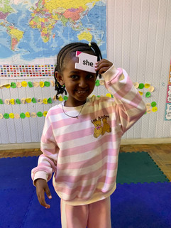 This week’s literacy sessions were fun and engaging as we explored the world of nouns and pronouns. In our first session, we discussed what nouns and pronouns are by using examples such as our personal names, countries, and cities. Afterward, we practiced identifying pronouns by asking each other which pronouns we use. It brought lots of laughter when some mixed them up; like a girl saying “he” or a boy saying “she.” Through this, we learned that boys are referred to as “he,” girls as “she,” and objects or animals as “it.” We also worked on sorting activities using pronoun words and picture cards. Our children matched pronouns with the correct images, their friends, and classroom objects, making the learning both interactive and meaningful.