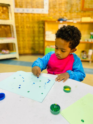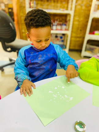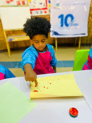 In our art session, the students enjoyed a fun finger-painting activity. First, they chose their favorite paint colors and wore their art smocks. Then, they dipped their index fingers into the paint and gently dropped the paint onto the paper. Some students used only their favorite color, while others explored different colors. To finish their artwork, they added glitter to make it shiny and special. The students were happy, creative, and excited to see their beautiful results.